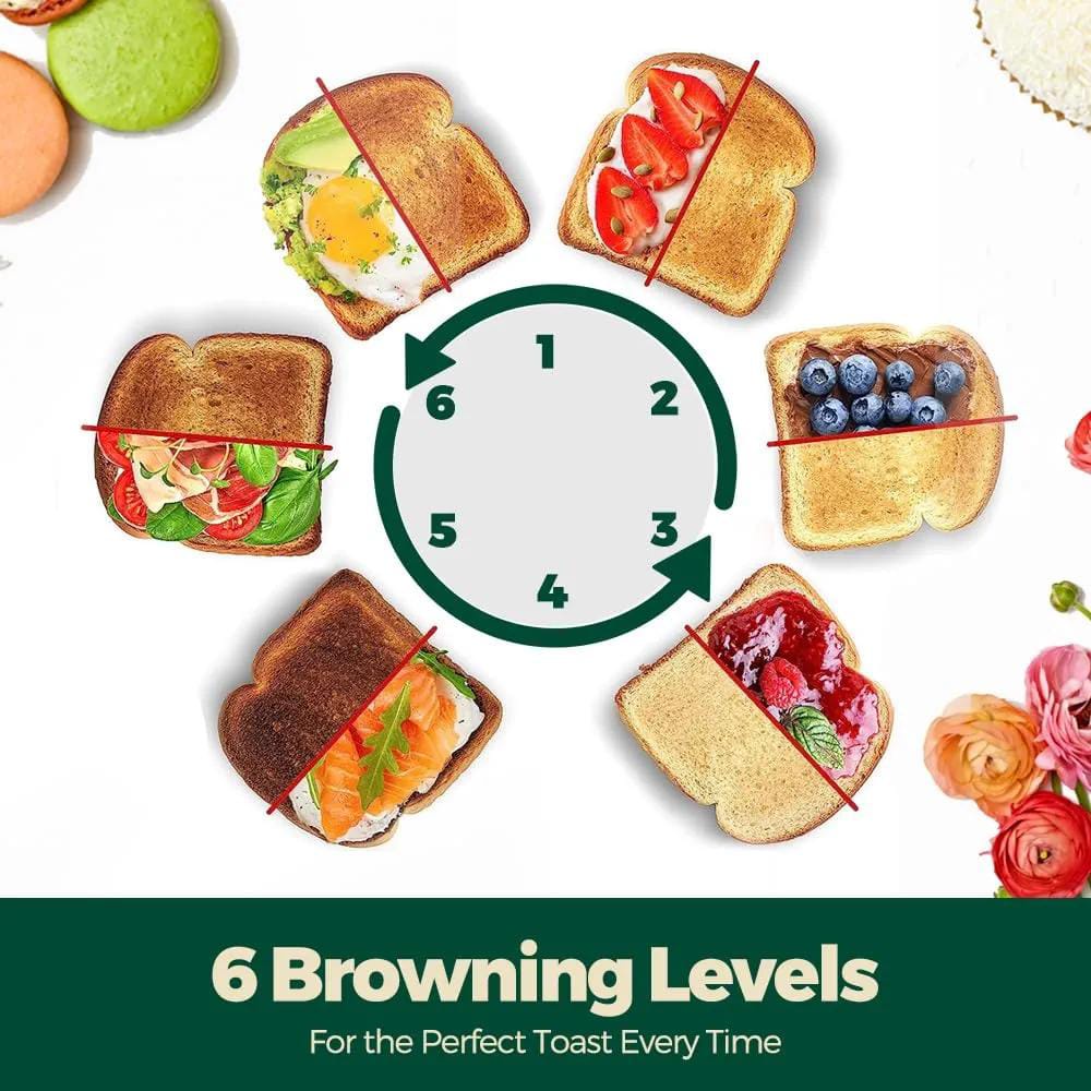 - تضمن ميزة الخبز المزدوج أن يتم تحميص خبزك بالتساوي، مما يمنحك وجبة إفطار لذيذة باستمرار كل صباح.