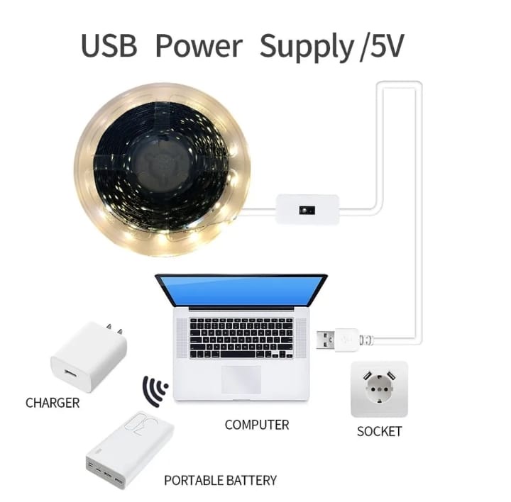 • يعمل USB:يعمل مصباح الشريط LED بواسطة USB ، مما يجعله سهل التركيب والاستخدام في أي غرفة دون الحاجة إلى