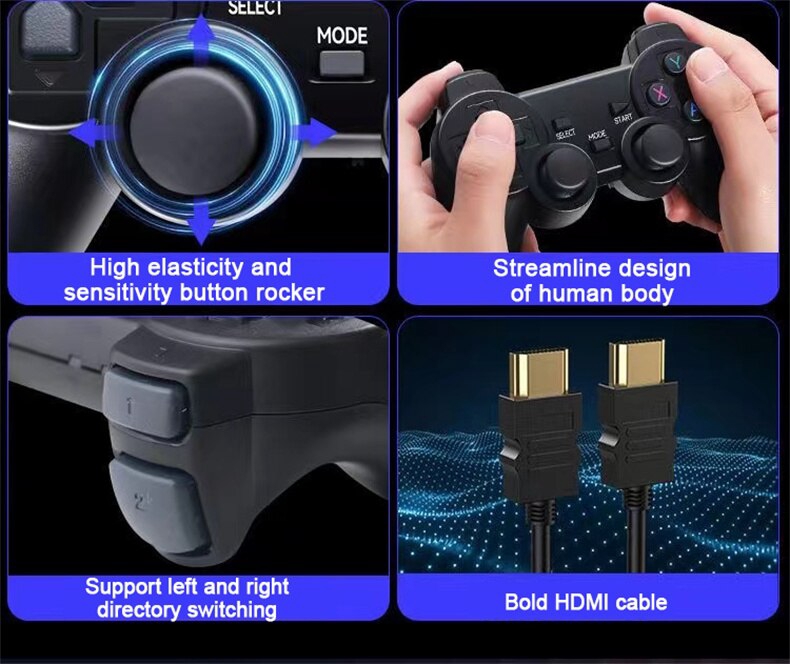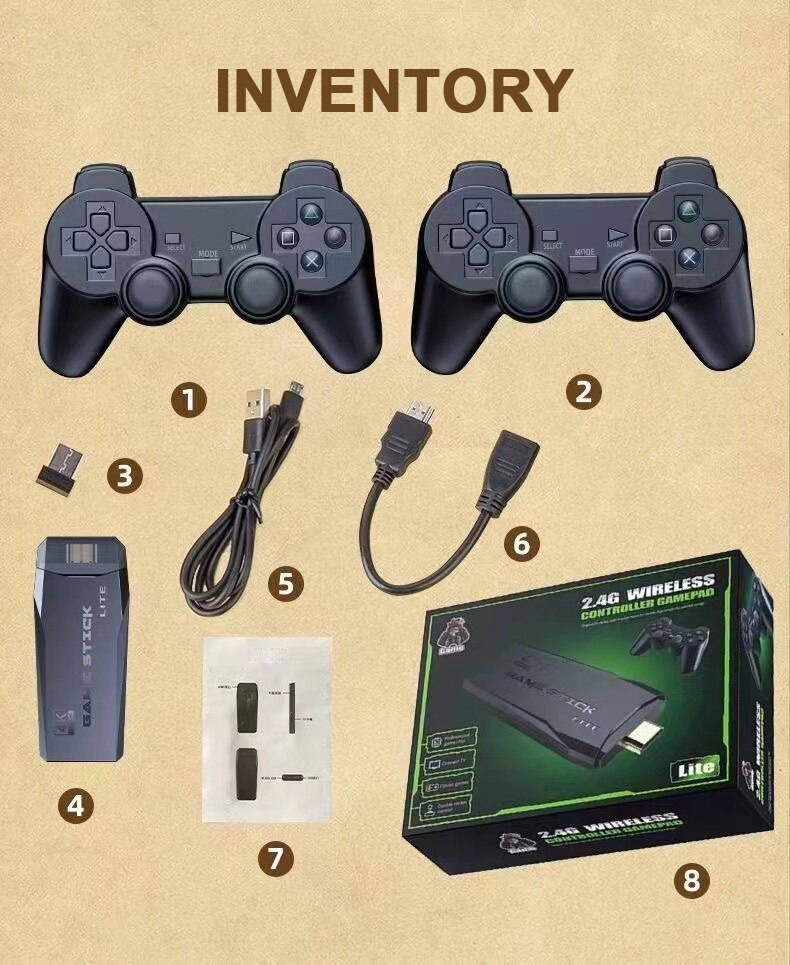دعم ألعاب التنزيل: تدعم وحدة التحكم في الألعاب هذه اللاعبين للبحث عن الألعاب ، وتدعم اللاعبين لتخصيص ألعابهم المفضلة ، ويمكنهم لعب الألعاب وتنزيلها بأنفسهم. مجهزة بعصي تحكم مزدوجة لاسلكية للعب جميع الألعاب الرائعة ، تجعلك تستمتع باللعبة أكثر ، تتيح لك تذكر طفولتك والاستمتاع بها بسرعة! إذا كنت بحاجة إلى قائمة ألعاب ، يمكنك الاتصال بخدمة العملاء للحصول على قائمة ألعاب!