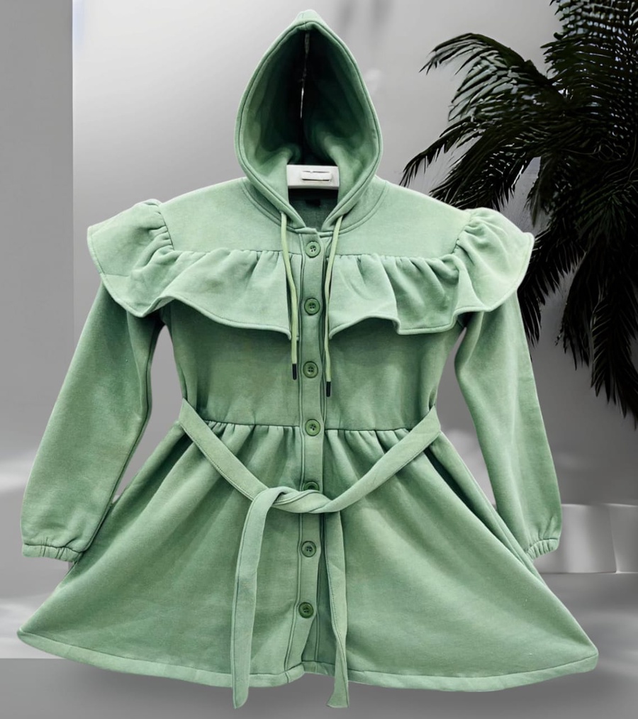 - التصميم: يأتي بغطاء رأس مدمج وأزرار أمامية لإضافة لمسة كلاسيكية، مع تفاصيل كشكش رائعة في منطقة الكتفين والصدر.